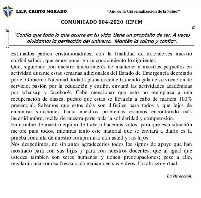 En la I.E. Colegio Cristo Morado buscamos fomentar personas autorizadas con una aumentada autoestima, conciencia, competencias sociales y una firme formación académica, moral y emocional para que puedan llegar el éxito personal y profesional dentro de una sociedad coetáneo y cambiante.